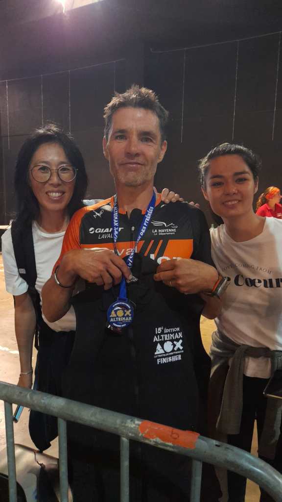 Je fais le 12ème temps de la course à pied remontant jusqu’à la 17 ème place. C’est galvanisant, ma femme et ma fille me retrouvent à intervalles réguliers, Claudius Brochard que je croise en bas me dit que je suis dans le top 20, La famille de Xavier m’annonce que je suis 16 ème. C’est top et je finis finalement 17ème, accompagné des miens en 15h31, plutôt frais pour un tel chantier.
