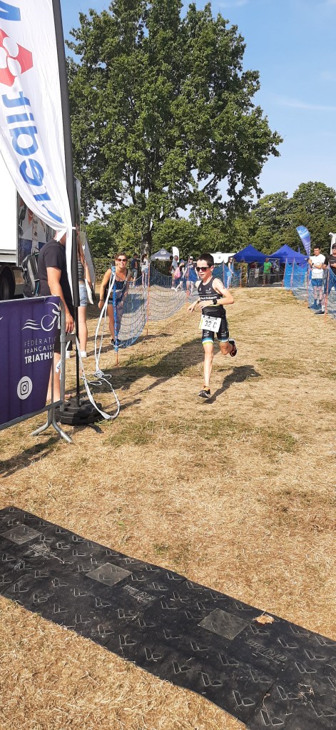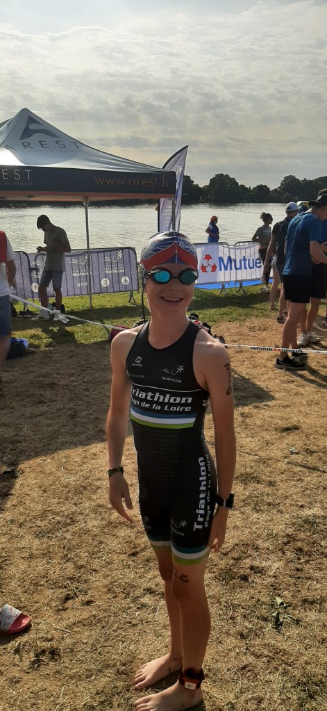 » Deux équipes représentaient les Pays de La Loire au championnat de France des ligues régionales de triathlon. C’était le 9 juillet 2023 au lac de La Tricherie de Mesnard La Barottière près du Puy-Du-Fou. La particularité du championnat de France des ligues régionales est de courir en relais par équipe mixte de 4 triathlètes : 1 garçon – 1 fille – 1 garçon – 1 fille. Je suis Benjamin 1ère année (catégorie 12-13 ans) et j’étais membre de la 2nde équipe sélectionnée par la ligue des Pays de La Loire avec Noé du Sco d’Angers, Aubane et Pauline du Mans Triathlon. Chacun notre tour, nous devions réaliser un triathlon XXS, c’est-à-dire 250m de natation, 6,3km de vélo et 2km de course à pied. La première équipe des Pays de La Loire est 6ème du classement général tandis que la nôtre termine le classement.