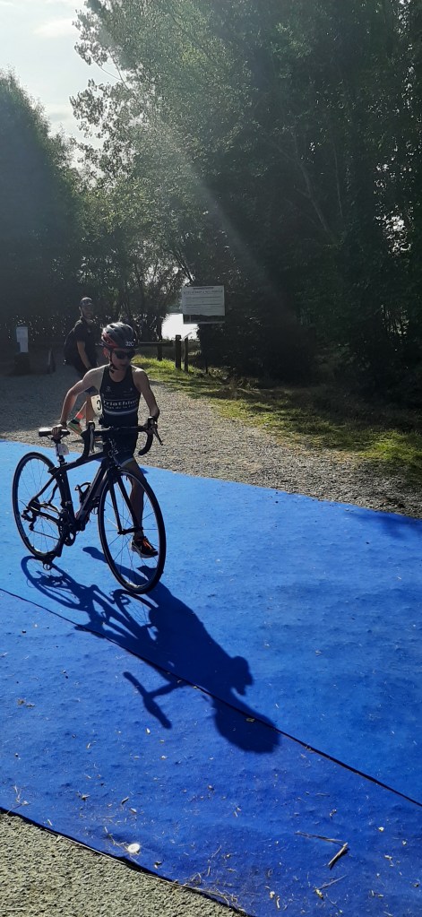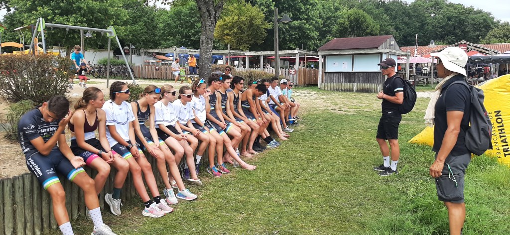 Ce très beau week-end commence le samedi 8 juillet en fin d’après-midi à proximité du lac où les coachs de la Ligue nous ont donné rendez-vous. Au programme, reconnaissance du parcours vélo. J’étais un petit peu stressé car je ne connaissais personne mais pendant qu’on roulait, j’ai discuté avec Gaspard Tharreau, sacré champion de France d’Aquathlon l’après-midi même (catégorie Junior : 18-19 ans). Après la reconnaissance vélo, nous sommes allés à l’hôtel. J’ai déposé mon vélo dans une salle puis j’ai récupéré mes affaires et les clés de ma chambre. Je dormais avec Noé, l’autre garçon de mon équipe qui est Benjamin 2ème année (catégorie 14-15 ans). Ensuite, nous sommes redescendus dans la salle pour le briefing avec Tristan, conseiller technique de la Ligue des Pays de La Loire. C’est à ce moment-là que j’appris que je serai le relayeur n°3 de l’équipe. Ensuite, j’ai essayé les vêtements offerts par la ligue et par l’organisation du championnat de France : une trifonction, 2 tee-shirts et un poncho. J’étais trop content car j’avais le droit de tout garder après la course ! Tristan m’a donné un sac où il y avait ma puce, mon bonnet de natation et mes étiquettes de vélo. Chacun a préparé ses équipements pour la compétition puis nous sommes allés manger. Le repas de l’hôtel était très bon mais un peu trop chargé. J’ai mangé avec Charles Beaucé (Sablé Triathlon) et Eliott Constantin (Sco d’Angers) membres de la première équipe et Noé, membre de mon équipe. Ensuite nous sommes allés nous coucher.