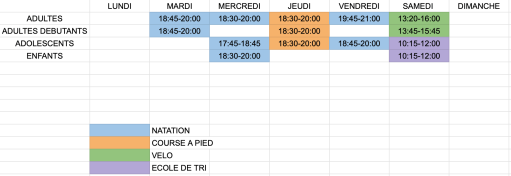Planning des entrainements pour la saison 2024-2025
