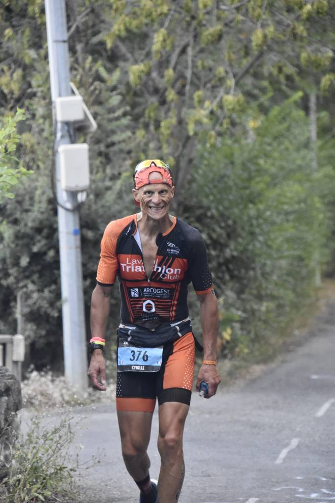 . Je suis marqué physiquement mais j’ai l’impression d’être bien, les km passent et même j’arrive à bien courir plusieurs fois 5’40 au kilo. Cool je vais mieux, j’alterne course et marche et ne cours jamais dans les montées. 1er tour fini (14 km) en 1h32. J’ai de l’avance et décide de ralentir, 2ème tour fini en 1h49 sans crampe mais la tête commence à tourner un peu de temps en temps. Je décide d’assurer et de ralentir (je sais que je serai finisher), les crampes reviennent, pas grave je ne pense plus à la douleur. Je profite du dernier tour pour remercier tous les bénévoles