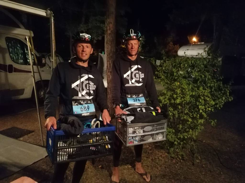 Pendant la transition, je prends mon temps et 2 masseuses essaient tant bien que mal de me diminuer les crampes pendant 15 minutes. Un bénévole me donne 2 cachets de sporteine (anti crampes) que je n’avais pas prévu, j’ai jamais eu de crampes de ma vie sur un tri