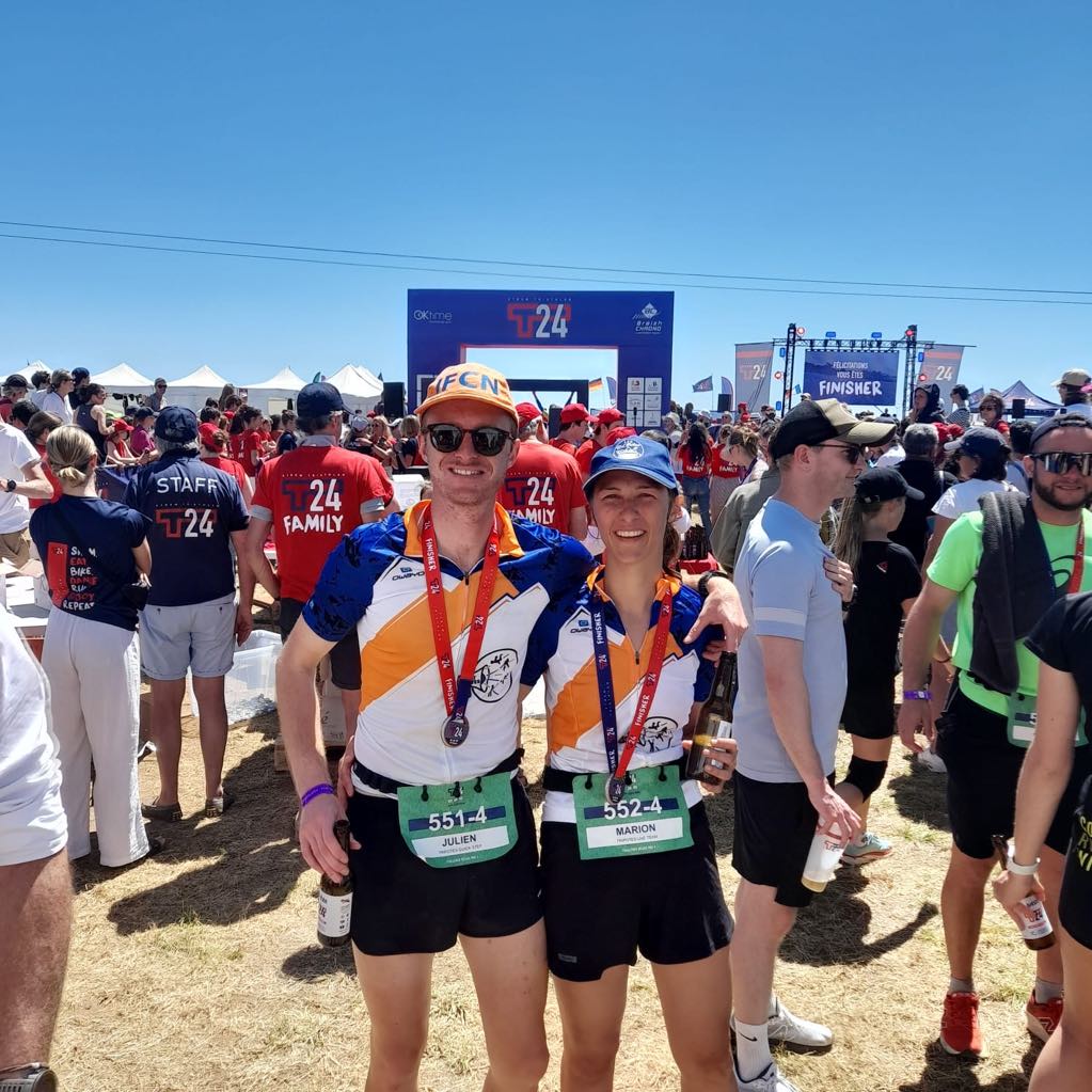 On retourne au village du T24 où tout est pensé pour une atmosphère incroyable. Food truck, scène, musique… même un feu d’artifice à 23h. C’est là que sont donnés les relais pour le vélo et la CAP. Le parcours est plat, les vélos fusent. Il faut bien rester vigilant la nuit quand tous nos repères changent et que le vent se lève. C’est une première pour nous deux de dormir en plein milieu d’un triathlon. Il faut gérer la fatigue psychologique et mentale. Arriver aussi frais que possible pour la CAP, tel est notre objectif.