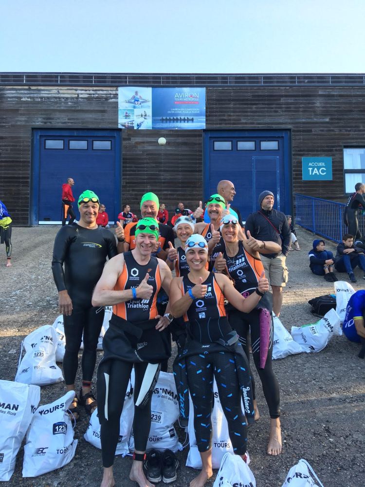 => 🏊 3,8km, 🚵♂️ 183km, 🤸♂️ 42km Samedi 25 septembre, 3h15, le réveil sonne… Je me lève, notre champion finit déjà de se préparer… – 3h50, c’est au tour des Poulettes de se lever… Ca pique!!… Papa est déjà parti avec le camion et toutes ses caisses de transitions préparées la veille.- 4h20, comme à Embrun en 2019, on part toutes les 3 pour 1,5km dans les rues de Saint-Jorioz afin de rejoindre le site, il fait nuit, les filles ont l’air presque habituées…- 4h40, nous rejoignons :=> Xav et Damien, nos guerriers du jour et compagnons d’entraînement => Marine…